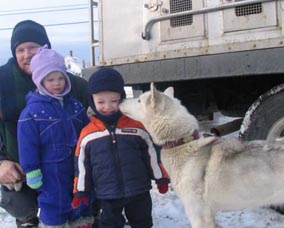 Our Maine dogsleding tour trips are "hands-on" experiences in which you'll be driving your own dogsled powered by a team of our friendly, handsome Canadian Inuit dogs. Our guides will accompany you to provide complete training, help out as needed, point out signs of wildlife and sights of scenic interest and share Northwoods lore. No experience is needed. Persons ages 5-75 have enjoyed these trips. Our dogteams and guides are busy most days December to March so please book in advance. |
